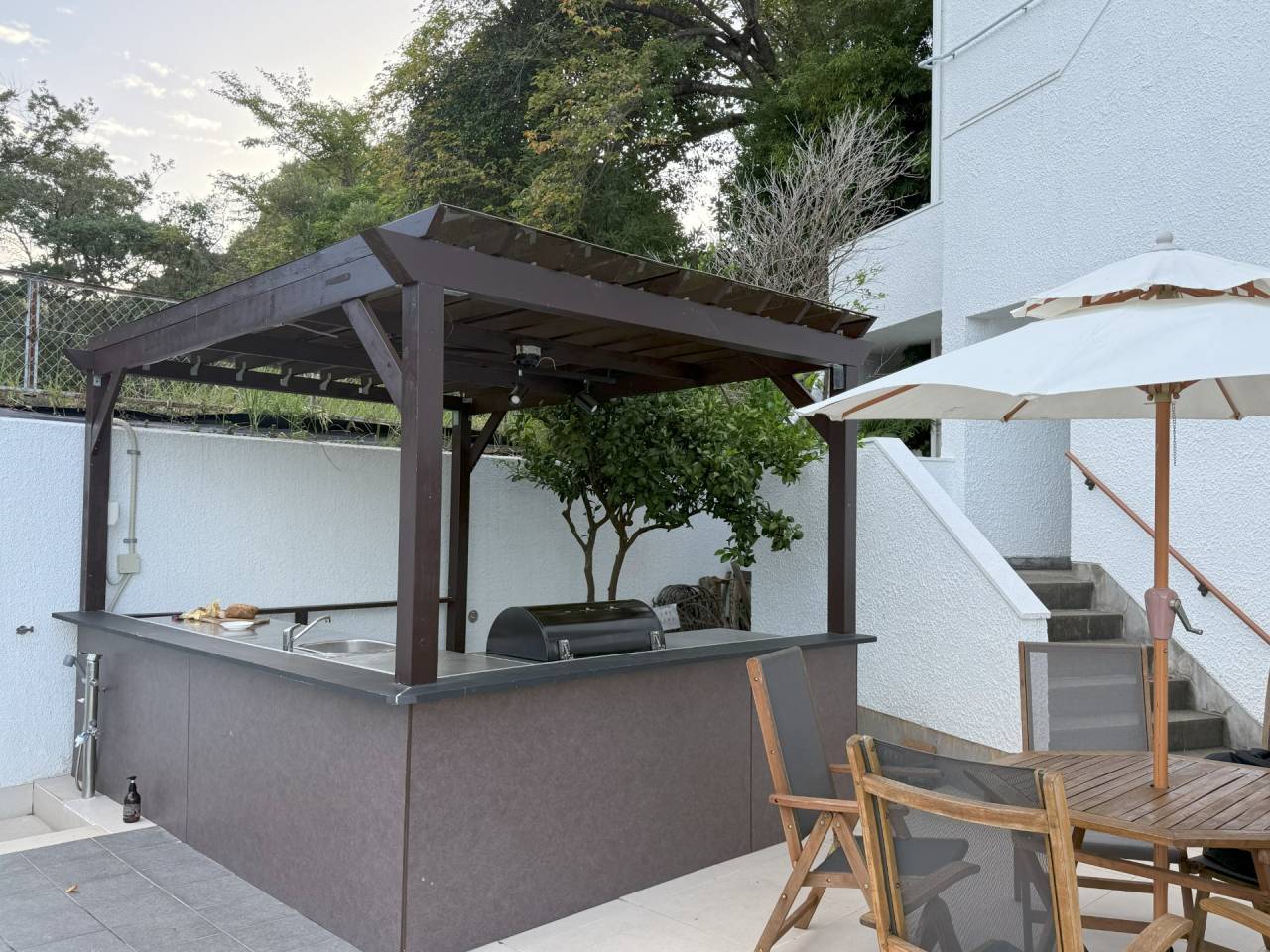BBQグッズや食器類を屋外キッチンコーナーに置くことで、手軽にBBQを楽しんでいただけるようになりました。